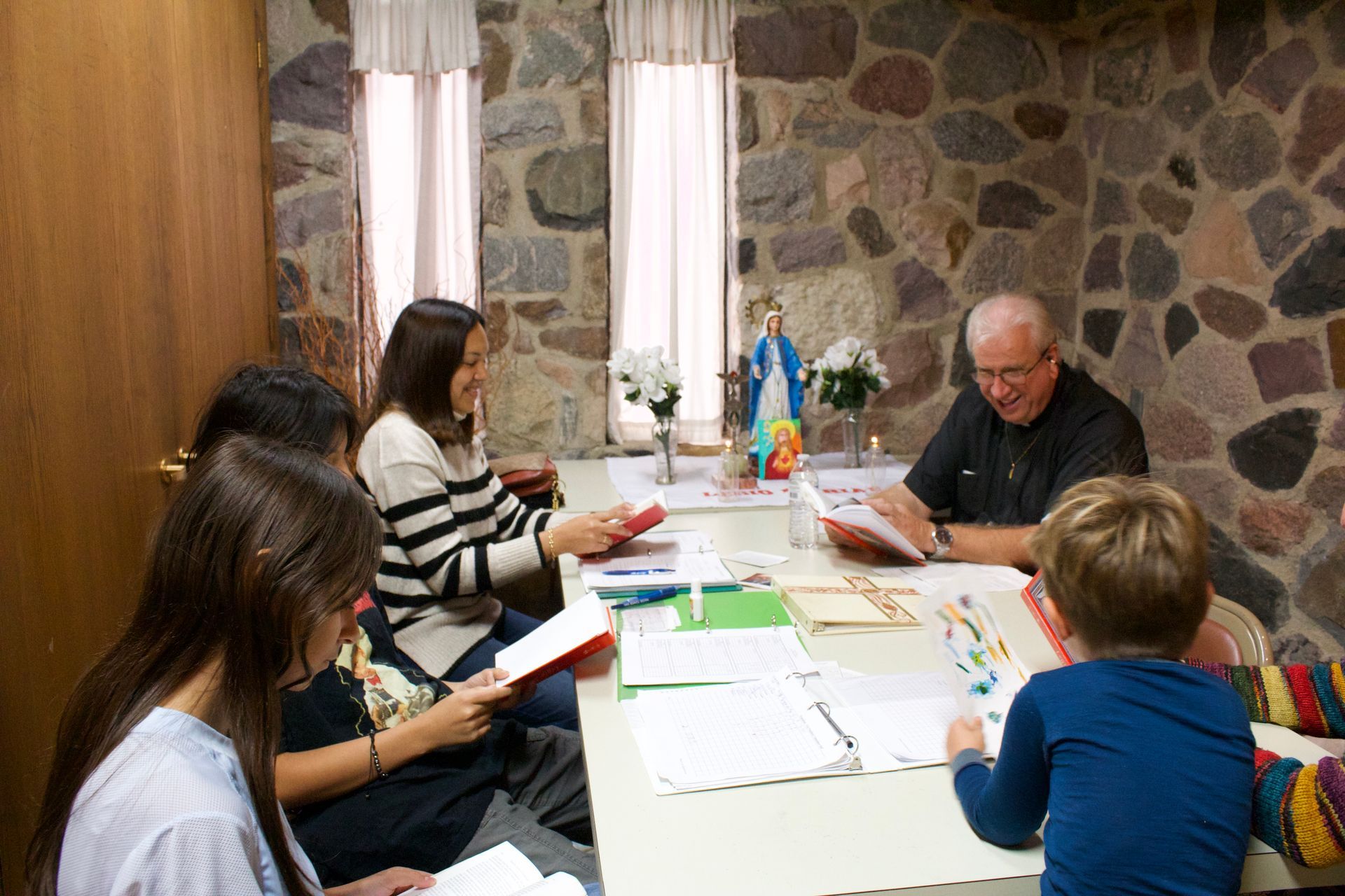 Nuestras reuniones incluyen rezar el Rosario y otras oraciones. Estudiamos nuestro Manual. También hablamos sobre las formas en que podemos llegar con la fe católica a otros.