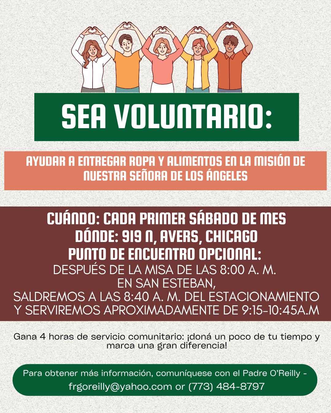 Cualquier donación puede dejarse en la oficina parroquial. Para más información, comunícate con el Padre O'Reilly al 773-484-8797 Ext: 245 o al correo electrónico frgoreilly@yahoo.com.